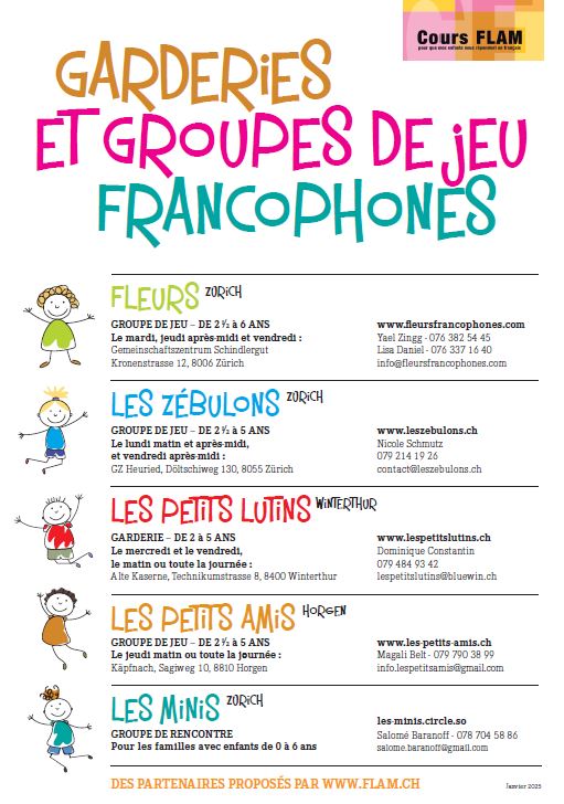Grâce au soutien du Conseil de l’Éducation du canton de Zurich (Bildungsrat), l’association « Cours FLAM – Français LAngue Maternelle » organise des cours de langue française s’adressant aux enfants francophones scolarisés dans le système scolaire zurichois (jardins d’enfants et écoles primaires).